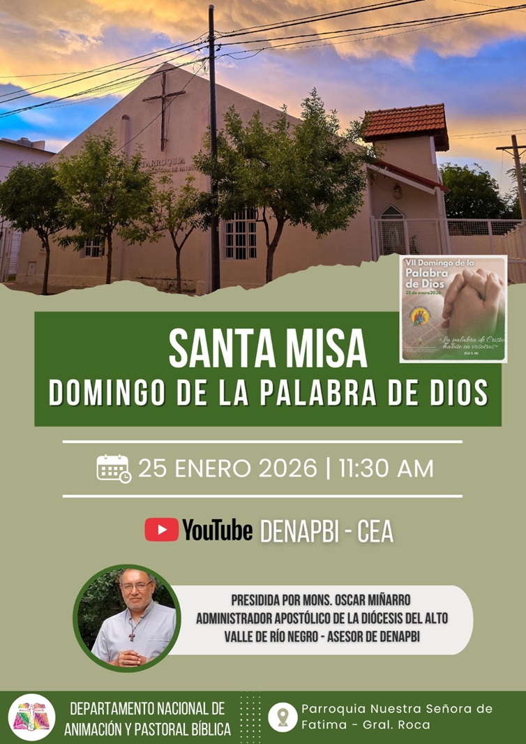 Podrá acompañarse siguiendo la transmisión el domingo 25 a las 11:30 hs., en vivo por el canal de YouTube del Departamento Nacional de Animación y Pastoral Bíblica (DeNAPBi), en: @denapbicea. También podrás unirte a la celebración desde Facebook e Instagram, en: ABP – CEA.