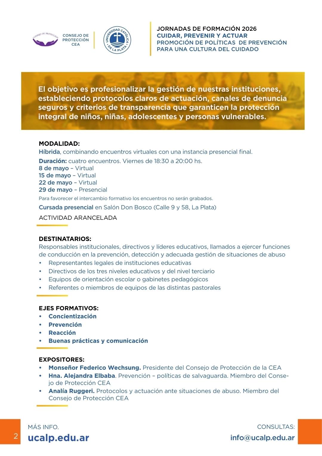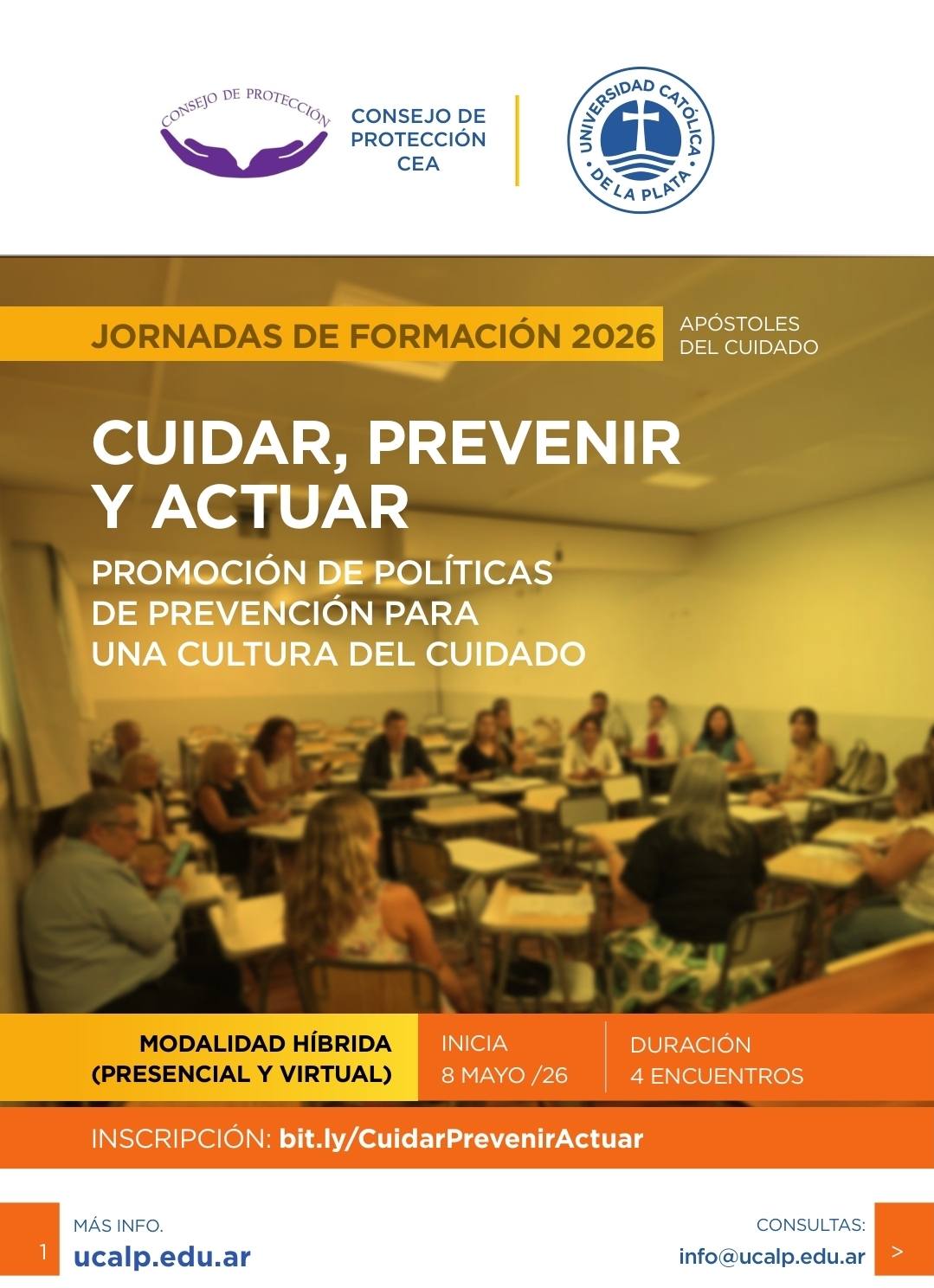 De este modo animamos la participación en el curso coordinado por este el Consejo de Protección del Conferencia Episcopal Argentina y la Universidad Católica de La Plata compartiendo un ciclo de cuatro encuentros bajo la modalidad híbrida (3 digitales y 1 -el último- presencial), promoviendo entonces Jornadas de Prevención llevando por lema: "Cuidar, Prevenir y Actuar. Promoción de políticas de prevención para una cultura del cuidado".